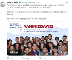 Konuyla ilgili olarak sosyal medya hesaplarından açıklama yapan Başkan Yavaş, “Sosyal yardım alan ailelerin ve pandemi nedeniyle kapanan sektör çalışanlarının çocuklarının YKS ücretlerini karşılayacağımızı söylemiştik. Başvuran 6521 evladımızın sınav ücretlerini harçlıklarıyla beraber hesaplarına yatırdık. Yarınların umudu gençlerimize başarılar diliyorum” ifadelerini kullandı.