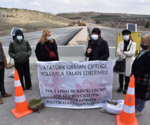 Basın açıklamasında üzerinde “Atatürk Orman Çiftliği yollarla talan edilemez. Yol yapımı durdurulsun! Ankara Büyükşehir Belediyesi Gökçek politikalarından vazgeç!” yazılı pankart açıldı.